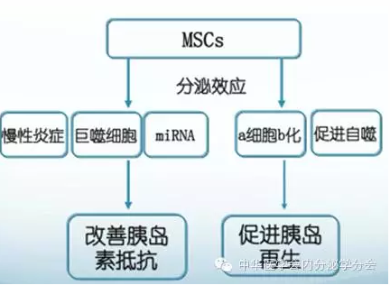 眾所周知,1型糖尿病是由胰島β細胞自身免疫炎癥所導致的β細胞破壞,而2型糖尿病則是胰島β細胞功能受損及胰島素抵抗共同作用的結果。因而,理想的治愈糖尿病的策略,必然要針對上述關鍵環節。母教授團隊的研究顯示,MSC同時具備上述兩方面的作用:通過其分泌效應,減輕慢性炎癥,促進巨噬細胞向抗炎M2型巨噬細胞轉變,通過外泌體中的miRNA減輕胰島素抵抗;促進b細胞自噬,促進alpha細胞向beta細胞轉變保護b細胞,促進b細胞再生。兩方面共同作用下,產生降糖效應。