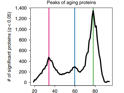 2019年底發表在Nature上的一篇文獻顯示,Wyss-Coray等人分析了來自4263名18-95歲人群的血漿后發現:在人類生命周期中,衰老并不是勻速發展的,而是似乎在三個時間點有劇烈波動,這三個點平均發生在34歲,60歲和78歲。