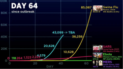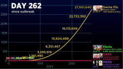 墨西哥甲型H1N1流感在疾病爆發的40多天后開始失控,第47天感染人數超過同時期SARS,第64天(85087人)超過爆發第55天的新冠病毒(77262人)。此后一發而不可收拾,到第600天時已造成6千萬人感染,29萬多人死亡,病死率0.5%。