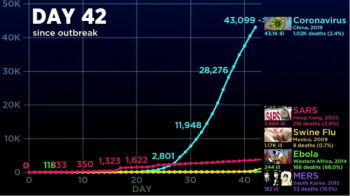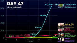 COVID-19相對SARS起病慢,無癥狀也傳染,因此數據有一定滯后性。其感染人數則在第26天超過同時期的SARS,截止視頻制作的時間,數據停在第42天的43099人。