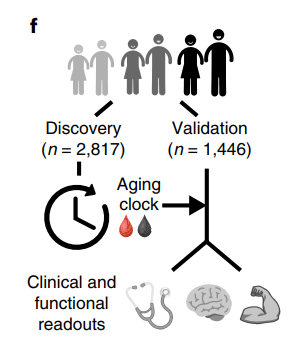 在這項研究中,Wyss-Coray等人嘗試建立了一個“蛋白質組學時鐘”,在總共1379種隨年齡增長變化顯著的血漿蛋白中,使用了其中的373種來預測參與者的生理年齡。