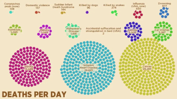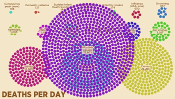 Abacaba以2月10日COVID-19造成的108人死亡作為參照(左上角),全球每天死于家庭暴力的人數(137)已經超過了這個數字,而腫瘤、缺血性心臟病和休克每天分別造成26283人、24641人和13689人死亡。截至2月25日,COVID-19造成的死亡人數還低于車禍每天造成的死亡人數(3287)。