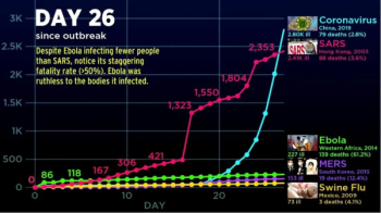 外網UP主Abacaba在2月12日上傳了一個視頻,引用數據比較了COVID-19、2015年的MERS、2014年的Ebola、2009年的墨西哥流感(H1N1)、2003年的SARS及1918年的西班牙流感(H1N1),并同步了時間軸起點,試圖直觀的展示各種病毒的不同表現。