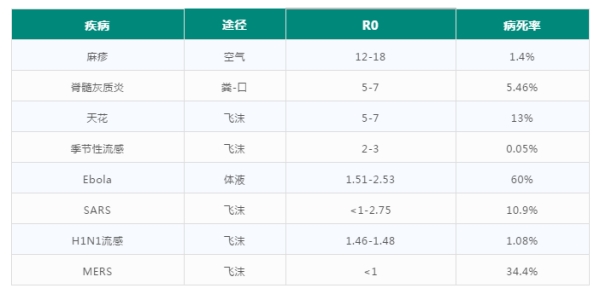 各種病毒性疾病的基本傳染數R0值(值越高,傳染性越強)和病死率: