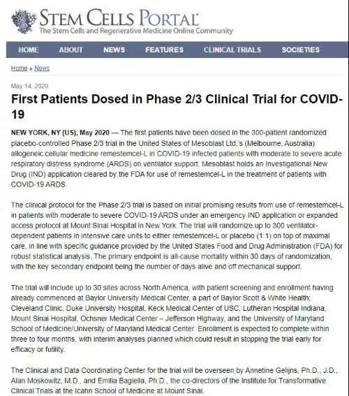 報告中提到了兩項試點研究,一項是3月份西奈山醫院的研究,一項是7月份發表在《柳葉刀》上的研究。間充質干細胞被用來治療這兩項研究之間的25個重癥COVID-19病例。在3月的試驗中,12名患者中有10人存活下來。而在7月的試驗中,13名患者中有11人存活下來。