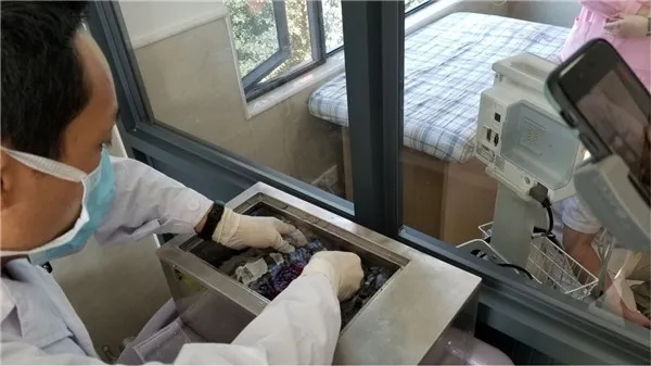 6月17日上午10點20分左右,廣東省婦幼保健院康復樓的輸液室里,四川臍血庫工作人員馮彪與醫生再次確認圍產期造血干細胞信息無誤后,一邊戴上醫用橡膠手套,一邊將一根溫度計插入水中,38℃,然后他小心翼翼地從身旁的液氮罐中取出一份鮮紅的圍產期造血干細胞,慢慢浸入水中,并微微地搖晃著,讓它均勻受熱。