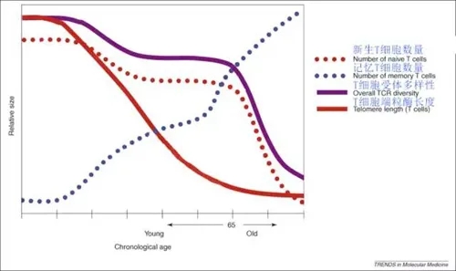 * TCR(T細胞受體)多樣性隨年齡增長而降低,適應性免疫細胞功能降低致使對外界的防御能力相應降低。