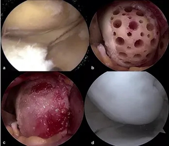研究團隊用關節鏡去毛刺裝置去除硬化的軟骨下骨后,以2mm的間隔開出4mm直徑的孔,然后將透明質酸和hUCB-MSCs混合并植入孔和其他關節缺損部位。根據病灶的大小,病灶的位置,病灶的數量,體重指數和年齡將患者分為兩組或三組,使用這些數據進行統計分析。