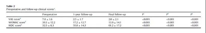 分析結果顯示:與術前相比,包括hUCB-MSC植入的手術后1年和2年的VAS,WOMAC和IKDC平均(±標準偏差)評分顯著提高(P <0.001)。病變部位差異有統計學意義(P <0.05)。未觀察到不良反應或術后并發癥,基于至少兩年的隨訪,證明了hUCB-MSC的植入對于治療膝骨性關節炎是有效的。