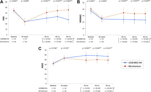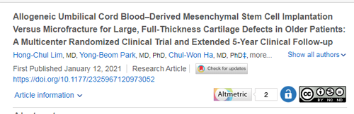 在這項為期48周的隨機對照III期臨床試驗中,臍帶血間充質干細胞與透明質酸的結合使用取得了顯著的效果,患者的VAS疼痛、WOMAC和IKDC評分較基線水平均有顯著改善,軟骨狀態也有了顯著改善。