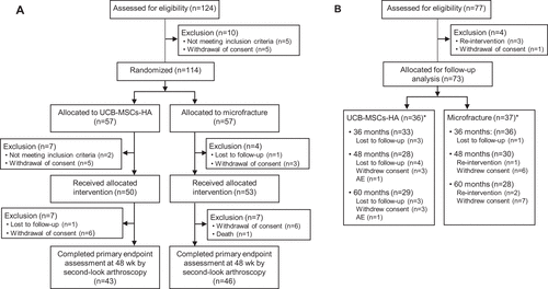 本次研究總共有114名患者參與,他們被隨機分配到UCB-MSC-HA移植治療組(57名患者)和微骨折手術對照組(57名患者)。最終共有89名患者完成了3期臨床試驗(治療組43例,對照組46例),其中73人參加了5年的隨訪研究。