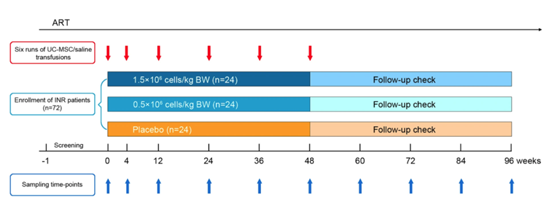因此,王福生院士團(tuán)隊(duì)進(jìn)一步開展了一項(xiàng)多中心、隨機(jī)、雙盲、安慰劑對照、劑量確定的II期臨床試驗(yàn)。該研究使用臍帶間充質(zhì)干細(xì)胞輸注治療,評估了免疫重建不良的艾滋病患者體內(nèi)CD4+細(xì)胞計(jì)數(shù)的變化。