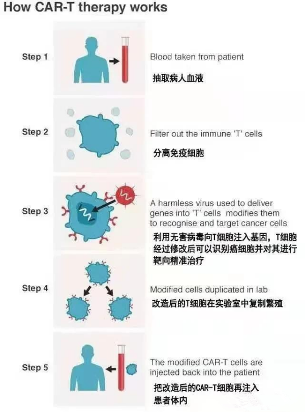 專家先從癌癥患者身上分離出其自身的免疫T細(xì)胞,在體外用基因工程改造的方式給它帶上一個“子彈頭”,然后將帶有“子彈頭”CAR-T細(xì)胞回輸?shù)讲∪梭w內(nèi)。