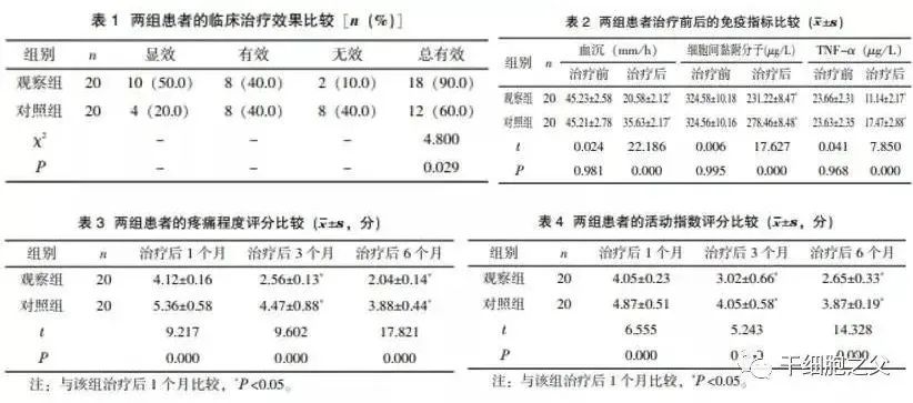 研究結果顯示,采用間充質干細胞的類風濕性關節炎受試者,明顯緩解和減輕臨床癥狀,其顯效率、有效率均明顯高于對照組。