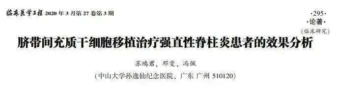2020年,一份臨床研究中選取中山大學孫逸仙紀念醫院2016年2月至2019年1月收治的40例強直性脊柱炎患者,隨機分為對照組和觀察組各20例。對照組采用免疫及生物制劑治療,觀察組采用臍帶間充質干細胞移植治療,對比兩組的臨床治療效果,可觀察組治療總有效率高于對照組(P<0.05)。
