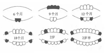 6個月的時候先長出下面的兩顆小門牙,9個月的時候長出上面的四顆小門牙,12個月的時候下面的兩顆小門牙開始長出,一歲半的時候第一顆大牙,上下左右各一顆,一共四顆長出來。這個時候就會留了一個縫隙,這個縫隙是留給兩歲時候長出來的小虎牙的,兩歲半的時候最后一顆大牙也開始成長了。